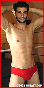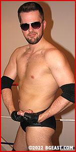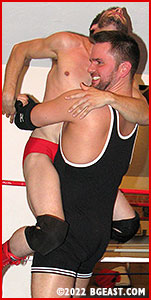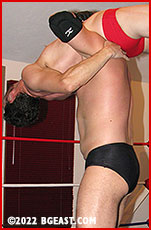 Check out Backyard Brawls 14 from Catalog 157 to see the prequel of this match, but even if you missed the prequel, this showdown between arch-heel Kayden and neo-heel Wolfboy should perk you up and make your underwear sticky. The action from that match's angry finale moves to the BGE ring, where Kayden holds the bright red gear he stole from Wolfboy - while seeing red at Wolfboy's jilting of Kayden the Trainer. "I'm going to win it back," Wolf says confidently, looking like a million bucks in new red trunks and red boots. Unfortunately, that's Keller's favorite look to tear apart piece by piece.