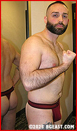 Mickey Knoxx looks damn good. He feels good, too. He's surrounded by a motel room full of hot wrestlers, and he's aching for the chance to take his freshly pumped muscles and shiny new gear out for a test drive. The problem is, he's already had his gorgeous ass handed to him by everyone in town for Wrestlefest already. His attempts to cajole, taunt, and tempt someone to give him another shot at his first Wrestlefest victory come up dry. However, "non" is not in the French Canadian's vocabulary. "I think I need some revenge," he snarls at Isaac Andrews, dragging the bearded hottie off the couch by his ankles.