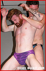 "I can clean the mats with your beard," brags Freddy as he drags the struggling ginger into a boston crab, the hard way. A floating octopus back cruncher submission and a face buster leave Forrest even more vulnerable and soon his trunks are removed as in the game, revealing his provocative jockstrap.