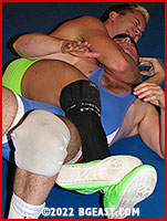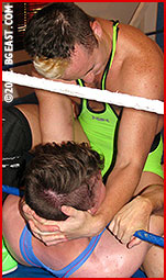 Hawk, having just a bit more experience than Ty, pins the twunk under his knee with a crotch claw