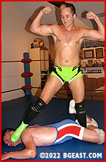 Then the three minutes are up. What follows is a series of back-and-forth assaults that focus on the two men's crotches while the tormenter squats on the other guy's face. All the while, both men work up a dense sweat. One man assumes total control in the match's final minutes, and mercy is off the table. Heaving, sweat-drenched violence takes over. Agonized moans and screams fill the room. Joints and tendons are pushed to the breaking point. The victim's wails are high-pitched, partly choked back by pain and fear. A figure-four chokehold quenches all noise but the victor's gasping as he gulps down much-needed air. The loser's face is vacant, numb, all but lifeless. The winner rubs his crotch up and down the loser's face as he slowly calls out the 10-count. A stain on the crotch is the loser's only award.