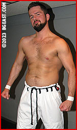 Belt chokes and aggression cedes to mutual respect, and finally nipple play, and a victory kiss after one particularly painful submission. Stripping out of their hot gis down to their underwear, the action starts to resemble many a sexy Kayden match, but this time it's Mason Broder who is sucked into his erotic vortex. This talented Spanish muscleman is becoming putty in the hands of BG East's erotic heel! His nipples get special attention and response. Alternating between punishing holds showing off their sweaty physiques, and humiliating bare feet on panting, exhausted faces, this match escalates into erotic territory with a combination of wrestling aggression and sensual enjoyment that showcases the best of both men, and a first for Mason Broder!