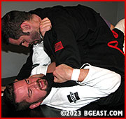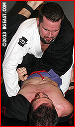 Mason climbs on top and drives his forearm into the throat of BGEast's top-reigning heel