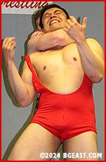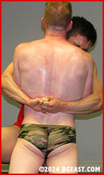 Forrest's booty swallows his trunks as he battles Anton in a mutual bearhug contest