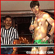 Axel aims to distract his opponent (and titillate the crowd) with a ass-baring trunkpull on Tiko