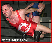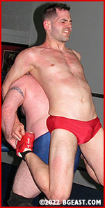 Broder does his best to score, but this is freakin' Jonny Firestorm he's in the ring with! Are we sure Broder even knows he's at BG East? No sooner does Mason appear to have locked up Jonny, Jonny either breaks loose or, more often, squashes him on the spot. Eight minutes into the match, Jonny strips Mason of his red singlet, thinking he will be leaving Broder in his "birthday suit," grumbling when he sees the red trunks his challenger wears under the singlet. Thus stripped, Mason displays a beautiful physique ... for a male fashion model. He's lean almost to the point of delicateness, but he is far from delicate or cowardly, as will be seen soon as he persists in taking and surviving everything Firestorm throws at him. He literally asked for it, and, boy, is he going to get it!