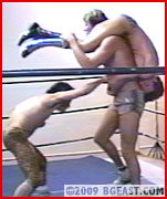 Like animals in a pack, they pounce, strip Armstrong of his sweatshirt and haul him into the wrestling ring. When you wrestle a giant stud like Armstrong you have to get him off his feet; it isn't easy in this case and the big guy does not go down willingly! Armstrong throws the two lighterweights around, one by one, but this and their repeated attacks begin to wear the big stud down. The WildCats smell blood! Their muscled bodies and big bulges, groping hands and horny desires soon have Kevin gasping. Of course, Katt and Leopard use their meanest underhanded tactics, from low blows to stomps and claws. Slowly, the writhing muscleman is worn out, ridden by crabs, splayed out in the corner, his balls beaten and his stomach battered... What these two do to Armstrong is vicious, humiliating and hot! And when they strip him of his gym shorts and discover a baby blue thong hiding underneath, it's like an aphrodisiac blast of energy! These two horny heels in leopard gear are like two wild felines taking down a struggling giraffe. Kevin gets double teamed, tied, and finally hauled out of the ring to the locker room for further mauling, mayhem, and gawd knows what else! A two-on-one sexy gear on sexy bodies BG classic!