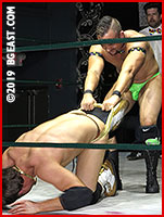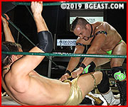 Ty and Jordi go toe-to-toe and tit for tat in this match, fighting tooth and nail not to give the other an inch. Through the passion with which they mercilessly pound each other back and forth across this ring, you can see some of the spark that made them a team in the first place. But sooner or later, all the ass-slaps, bronco busters, and nipple biting ab stretches take their toll, and one man finally hits the canvas in nothing but a thong, and we hear those decisive three numbers from our guest referee Enoch. The main event is over, and one of these two divas is standing proud in the ring at the close of BGE's Wrestling with Pride 2. And maybe, just maybe, win or lose, Jordi and Ty will find some common ground, and come back together for one last surprise for the crowd before the end of the night.