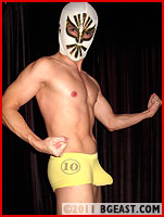 The two step up to each other, chest to chest, mask to mask, and bulge versus bulge - and the animal attraction they feel for each other is apparent as they slowly and sensually begin to match mounds, the bulges inside their trunks eager for contact and combat. Once the silent challenge has been made and the initial manhood to manhood match-up has begun, Gold Shaft reaches across and slowly, tantalizingly peels the Cock Avenger's outer trunks down, revealing his chosen specially cut battle briefs. His battle bulge exposed and ready for action, Cock Avenger returns the favor, peeling Gold Shaft's outer yellow trunks down, revealing battle gear which had to have been designed with cockfighting in mind!