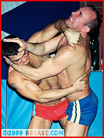 In tank-tops and training pants, sexy Dane and super hunky Frenchman Leo inaugurate our brand new London matroom with the kind of action that separates the men from the boys. Muscles strain beautifully as each hunk struggles for dominance, frequently resorting to such tactics as choking, ballgrabbing, nipple pinching and biting, face sitting, and bare butt slapping and worship! Powerful Leo has Dane screaming in many brutal submissions, often while kissing or sensually sucking his ear. This is wrestling for MEN!