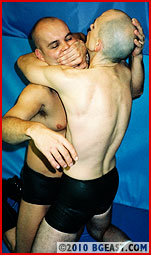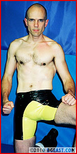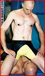Kid Vicious has often found his 'look' is popular among the badboy wannabe's around the world, but especially in England, and when he saw the photos sent to him by Steve Ranger, he knew he wanted to take this rookie fighter down a notch. Eager to show he's up for the battle, Steve requested KV's rubber gear. Was this to throw off the yank skinhead, or a confession that he'd be aroused by them? Either way, KV was more than happy to wear the skin-hugging rubber style trunks, in hopes of pressing some advantage!