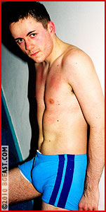 Jim evens the score with a brutal bodyscissor-choke, and Simon nearly gets his arm torn off and a face full of Jim's foot. More chokes, a hammerlock submission, and a sexy boston crab follow. Each man seems to enjoy his part in the battle, and the fighting goes on til both men are worn out from the sexy beating. After the loser is counted out, the horny wrestlers begin sensually humping and "admiring" each other. Jim caresses Simon's big hard cock through his baby blue trunks before they leave the matroom to continue their encounter in private! Sensual Simon's a sexy new stud star!