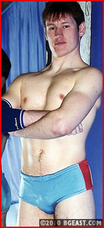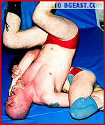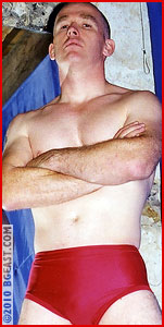 Jim is an Irishman with a decided size advantage over the Battleboy, but the younger, smaller Brit is not intimidated and surprises the tough skinhead by taking the first fall with a nasty submission. Battleboy's powder blue trunks add to his tough babyface appeal and Jim's tight red trunks showcase a great butt.