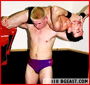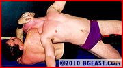 'C'mon, sonny, I've been waiting for this for a long time!' Andy is shorter but outweighs Leopard and easily tosses him around. His knock-out bearhug crushes the air out of the heel. Andy's sleeper means nite-nite for KL. But no one lays in a beating like KL: boots, fists, smashes to the gut, back and balls! Then there are those infamous Leopardlocks. And pretty blond boys are like catnip for this feline. A combination of both ring and mat skills means intense action and great holds as only two masters of the sport can concoct. Ballgrabbing, tit-twisting, face-slapping. KL treats Andy likes he's never been treated before. If you're into bouts like vet vs hot-shot, coach vs student, father vs son, this one's for you. (And one of these guys sustained a broken rib during this fight!)