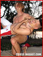 Mason mashes his bulge into his victim's face and smothers him in a double pec-claw