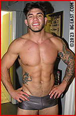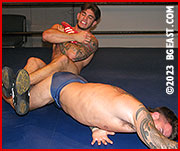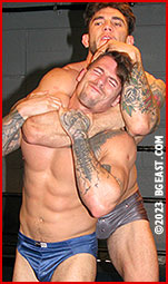 Angeles dominates the match's final minutes. He toys with Vigo, immobilizing him in preparation for a grand and possibly ruinous finisher. Against the turnbuckles, he grabs Vinny from behind with a corner chinlock, tightening the hold into all-out strangulation. With minutes remaining, Vinny rolls forward, breaking Tony's grip. He grabs the hair on the back of Tony's head, squats behind him, and strangles him with one arm while flexing with the other. He pulls Tony to his feet and applies a sleeperhold. Tony squirms like a worm on a fishhook. He grunts and jerks convulsively. Can he break free? Or is he doomed? If the finisher to this match doesn't get you hard, you have not been paying attention. Rough around the edges, Tony and Vinny, brimming with sex appeal, should make unique contributions to the BG East roster and house style.