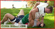 Sexy Alexi is still smarting from his brutal initiation at the hands of Brad Rochelle in THE CONTRACT. He went back to the gym and added about another fifteen pounds of muscle to an already amazing physique - and he's bitter. He's heard the locker room talk about him being another easy jobber, and that's a fate he's determined to avoid. Jonny was also battered by Brad, and others! And now both find themselves at that BG crossroads: Two young wrestlers with something to prove-a victory over the other means vindication and validation. This is going to be one nasty grudge match as Jonny attacks Alexi before they even hit the mats! They battle on the grass, move to the mats and then back into the grass again with neither wrestler getting an advantage until Alexi, fighting fire with fire, strips Johnny's shirt and power slams him onto the mats! As Jonny tries to get his breath back, Sexy Alexi chokes him with his own shirt! The tone is now set! The holds come fast and furious. Alexi drops all of his huge weight advantage onto Jonny's abs and delivers a gruesome gutbashing. But Alexi underestimates Jonny's speed, skill and determination and winds up on the receiving end of a crunching camel clutch! And that's just for starts!