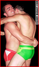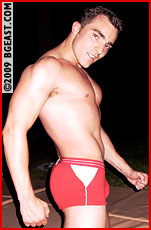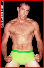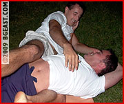 While most of BG East's outdoor matches are taped during the bright daylight, at night sometimes a different kind of wrestling beast will emerge. And sometimes the most unlikely of guys, the calmest, the coolest, the most centered, transform like the stalking werewolf of lore. Who better to test this hypothesis than two usually mild-mannered and gentlemanly Canadian hunks, TJ Tanner and Sandro? TJ is known for his tenacious style and cocky attitude, making verbal sparring inevitable. Sandro is one of Canada's loveliest exports to BG East. His sculpted body, phenomenal derriere and gorgeous smile are enough to make any wrestling fan melt. TJ is the taller and more experienced of the two, and so Sandro clearly understands that he needs to prove he's stronger both physically and mentally in order to win. And then there's their national rivalry at stake too!