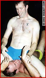 The grapplers walk out of the woods onto the moonlit mats, their mutual hunger evident in their eyes and in the heft of their speedos. High intensity grappling heavy with trash talking, body punching, and tight holds gets compounded by exploring hands that grope, claw and squeeze whatever they touch. The trash-talking doesn't stop until one forces the other to shut up! Then he drags the loser indoors to the very dark and private basement mat room to continue the match in total seclusion. Full hardons lead to trunks stripped to full nudity. Salacious face humping. The loser is forced to suck the winner's cock. Intensely erotic!