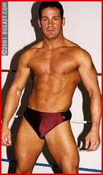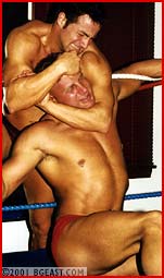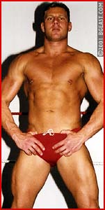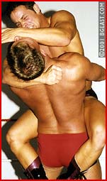 Here's another hot match which pursues pro action and pro gear to the classic ideal. Antonio's chaps, cowboy hat and supreme attitude make for a striking contrast to All-American Jeff in his incredibly sexy "old-style" perfectly-packed red pro trunks, white boots and waist-length ring jacket. Whoa nellie! Ride 'em. Cowboy! Antonio pushes Jeff to test him and finds out the big blond rookie is not only tough but has a body slam to rattle the rafters, and a bear hug that could breaks backs! Antonio is a classic, cocky heel-boy with plenty of gusto and brio. He pushes the big boy right to the edge. When he can take it no longer, Jeff grabs the punk heel by the throat and straight-arms him right back away. But the big rookie makes the classic babyface mistake of letting down his guard and when Antonio says 'Feel the wrath of the Cowboy', Jeff is in big trouble! Sleeper finish.