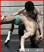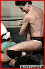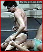 These guys are virtually even in height, weight and strength but that doesn't stop Tyson from trying to score early and fast with a bearhug - in fact, a whole series of bearhugs! Leopard targets Tyson's ample pecs, digging deep and punching them red. They trade rack back-breakers but Leopard adds a crucial variation to his - a ball claw! When the black stud misses a dropkick, KL moves in for the kill with a level of viciousness reserved only for those like Johnson, who submit most reluctantly. He hangs the stud in the corner and assaults his abs, pecs and balls. Then he applies what many consider the most brutal submission hold in wrestling, his "Killer". Instant screaming submission! Tyson becomes his toy, a plaything to punish and completely humiliate. Finally he begins his Triple Terror Trifecta finish - 3 successive sleeper variations concluding with the Sicilian Kiss of Death. Totally sexy!