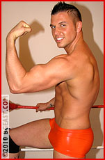 Eddy and Donnie are two of BGE's sexiest toughs. Donnie has undergone a startling metamorphosis, both in physique and in character. His body is getting stronger, its lines sleek, symmetrical, and firm. Simultaneously, he has developed ferocity not at all apparent when he first stepped into the BGE ring. Just recently he was honored with his second Wrestler Spotlight. In the opposite corner, Eddy matches Donnie pound for pound and inch for inch. Eddy's body is solid as a bullet. In his two previous bouts here, he has faced Lon Dumont, in a novel and deliriously exciting forced-to-flex match, and Aryx Quinn, whom he fought nearly to a standoff till he teamed up with The Boss to exact some savage and terrible punishment on the renegade Quinn. In both matches, which have not always worked out in his favor, Eddy exudes the flash and fire of his native Brazil. Bringing these two wrestlers together, then, is An Event. Here is a clash of two wrestling titans.