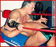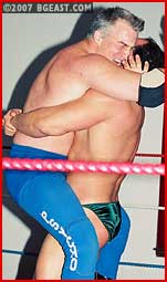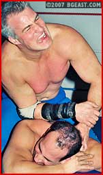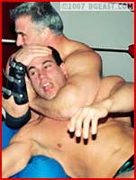Massive muscled Johnny in posing trunks vs the beefy, mouthy vet for a pro lesson: pounding and punishing him, grinding his face into the mat with his boot. Johnny gets manhandled, choked, clotheslined, slammed, DDT'd! He fights back with bearhugs and headscissors, but they're no match for Psycho-mania. Claws to the big dude's traps have him in submission agony! After a hangman submission and two bulldog headlocks, the knocked out bodybuilder gets pinned for a 10 count. All in a day's work for the wild man pro champ!