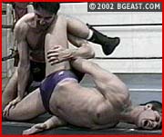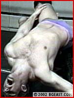 Cliff's a gorgeous, All-American athlete with a superbly humpy physique. He's also a tough wrestler and a hot-headed 19 year old with an attitude. Leopard starts things off with a humiliating slap to the face - bait which, to his regret, the young guy bites. Cliff smoothly shifts his comeback bearhug into a boston crab and then back into the bearhug. Leopard gets slammed and suplexed and bent into a crucifix submission. Cliff taunts and torments the veteran heel. A swift knee lift puts an end to that! Cliff gets clawed, pounded, stomped and submits to an Indian Deathlock. He splits the stud's legs wide, earns another submission but that incredibly pretty exposed bulge is just too tempting a target for KL to resist: he shoots a quick but painful paw-jab right into the purple pouch. Cliff gets treated to the Triple Terror Trifecta. For sleeper fans, it doesn't get much hotter than this: the 175# Hollywood-star-handsome teen slowly but surely falling into the abyss of blackness dictated by a heel who weighs 30# less.
