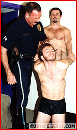 Dex became Shane's "mentor" in Dark Knights 1. Shane schedules some side action with Rob Mullen while Dex is out. Rob doesn't even get out of his street clothes before the two go at it in an amazingly intense apartment fight. Rob's white bike shorts show his great butt. Ball-grabbing, intense backbreakers over the knee and across the shoulders! As Rob screams in submission, uniformed Dex appears! Dex takes command, stripping shirtless as Shane strips Rob nude. He displays Rob in holds for his boss' delectation, then they dress the defeated muscleboy in leather. Dex demands muscle worship, but the two spunky boys attack their Master -- only to get scissored, choked, tortured and abused by the big boss.