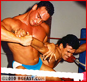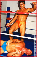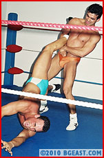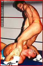 These cocky studs mouth off trying to psyche the other out. Both wear tigers in the ring in their oh-so-skimpy gear, trying for a sexy psych-out as well. Our latino star comes on strong using kicks, throws, and arm torture. Greg's on beautiful display as he suffers. His pride won't let him give until his arm's nearly broken! At 2 falls each, the studs strip off their bikinis, revealing their now-hard rods for the deciding falls. The victor insists on multiple painful submissions, enjoying the screams of his hurt opponent. One helluva hot'n'nasty beat down that kicked off the Submissions series with a BG East 'Hard Pro' style match! Clash of the Muscle Badboys!