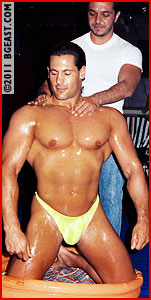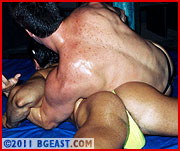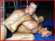 Make sure you save some for this next match 'cause we've saved the best for last. Dante was a rookie but one with pro aspirations and like many rookies, he thinks he can challenge and even take the vet. And he gives Psycho a run for the money to the point where our star pro has to get pretty rough. Phenomenal muscle on display, and a wide range of both skillfull and overtly rough action from both fighters. Hot submissions and big beef on display. Dante is big, bad and beautiful. Just ask our Joey Pappaluca who served as the adoring manager who oiled him up. HOT!!!