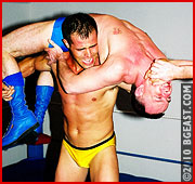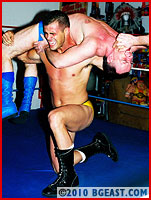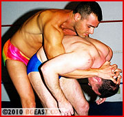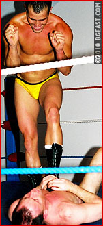 When Steve crossed the Atlantic to make his BGEast debut, Mikey was at the top of his hit list. To Steve's wearing of a Union Jack cape, Mikey quips "Captain Cupcake Invades America!" Steve is outweighed, outmuscled and outclassed by the wily veteran. Mikey's arrogant swagger excites the game Brit, but inside he also knows he a lamb to the slaughter. And a slaughter it is!