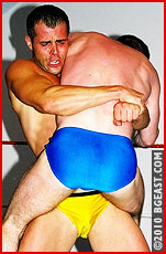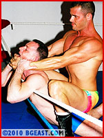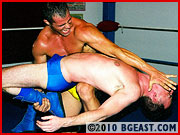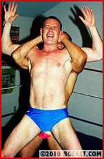 Steve falls prey to Mikey's powerful embrace, becoming not once, but 3 times the victim of a sexy series of bearhugs. After cockily pinning the rookie, Mikey subjects him to some extraordinary post-match headscisors and sleeper punishment while forcing Steve to watch one of Mikey's previous triumphs on video!! Talk about arrogant! This is what Demolition dreams are made of!