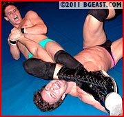 Fans of the long, strenuous, and potentially debilitating agonies of the arm bar will not want to wait to put their order in for this fight. Dick Rick is a master of the hold, with a body built for planting boots to the chest and neck of an opponent and cranking the arm till the pits are somewhere between the guy's shoulder blades. But never underestimate the clean-cut rookie. If you learn nothing else from watching pro wrestling, you learn that. Dick makes as if to break the young challenger in two. Pete survives Dick's crippling holds long enough to give the arrogant heel a taste of his own medicine and actually win the first fall. Pete's limber six-foot-three build and fighting heart prove a fair match for Dick's brawn and nasty attitude. This might only be Peter's fourth match at BG East, but he's already tested himself against some formidable foes in Cameron Mathews, Exavier, and Greg Garrett - and while not always victorious, he's always managed to impress.
