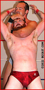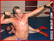 Forrest is a ninja in the opening moments of this match. Kirk is notoriously fast on his feet, but Forrest nearly runs circles around him, ducking each attempt the veteran makes to lock-up with him. The game of cat-and-mouse prompts Kirk to impatiently rush in one more time, which is precisely what the rookie phenom was waiting for. In a move straight out of Kirk's own playbook, Forrest leaps into the air, snags his opponent's head between his milky thighs, and sends Kirk flying across the ring. The bearded lightweight stays a step ahead, landing one high impact maneuver after another, and begging the question of just who is the cat, and who is the mouse!
