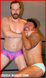 The two hunks circle each other, their eyes studying the curves of the other wrestler's body. They lockup old-school style, arms locked, pushing back and forth. Luis shoves Kirk to the mat, but the old pro is quick on a rebound. Another lockup, and another embarrassing fall for Kirk. Donahue looks none too pleased. He takes ten seconds to warm up. The two bodies lunge at each other again. This time Kirk gets Luis in an iron-clad side headlock. The newbie snarls like a dog on a bone. With a sudden thrust, he breaks loose and instantly locks Kirk's head under his left arm and crunches.