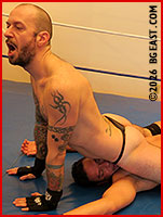 "The fight starts now," Sir Dark declares, shifting his unbridled aggression into high gear. He's too fast and too aggressive for Santiago to keep in check. A single leg take down puts the muscle man on his back, legs forced wide apart, and Sir Dark's heel stomping savagely into his balls. Again, and again, he's two steps ahead of his opponent, trapping the pretty boy into a fresh agonizing submission hold every time Santiago tries to fight back. "You had this coming, Sir Dark declares with a lip curling snarl, as he leaps off the ropes and batters the stunned stud like a missile.