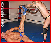 Santiago's excess of muscle and size set the pace as this fierce battle unfolds. He's packing way too much power for Sir Dark to match. Every test of strength ends with Sir Dark backed into a corner by the smirking muscle boy. Santiago scoops and slams Sir Dark without meeting serious resistance. "Come on, really? Look at these muscles," he snarls in his opponent's face when Sir Dark gets more and more pissed at being so easily manhandled. To add insult to injury, he rips Sir Dark's trunks off within minutes, leaving the raging Italian wearing nothing but a thong and red-hot rage.