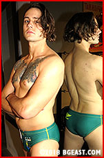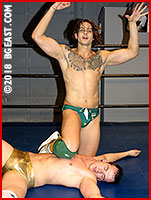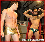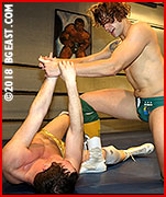 Zip Zarella and Kirk Donahue are cut from the same cloth. Both accomplished young indy pro veterans have taken BG East by storm with a combination of high quality professional wrestling skills and smoking hot bodies. They're both showmen, each in his own way fueled by fan reactions. Kirk intends to be the best technical wrestler on the BG East roster, and his swelling ranks of fans can't get enough of his relentlessly paced chain wrestling and innovative submission holds. Zip, on the other hand, just wants to be the last man standing, flexing his magnificent muscles, and being the last, climactic image that you see before ecstasy overtakes you. From similar roots, with equivalent ring experience, they each have a different path in mind, but both hot hunks are as serious as a heart attack at being the next phenom that you can't stop talking about.