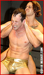 As the increasingly heated competition burns brighter, Kirk flips and flies, tying Zip up in humiliating knots and prying apart the muscle hunk's joints until he screams in panic. Zip counters with blunt force trauma, pounding the middleweight babyface from corner to corner and power slamming him repeatedly to the mat. "Huh, I seem to be kicking your ass," Zip taunts, crushing Kirk's face into the mat while literally standing on the back of his head. Whether you're rooting for technical skills and innovative holds or magnificent bodies flexing victoriously for your pleasure, this unrelenting sprint has it all. The outcome of this match may not sway your allegiance from one of these high class hunks to the other, but the winner is clearly pleased to deliver what BG East fans are clamoring for, including making his prey scream, "I'm a pathetic little bitch!"