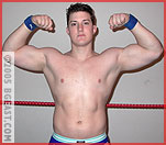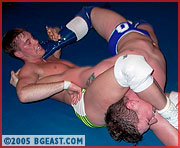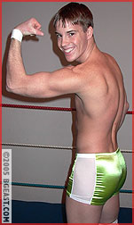 A dream match if there ever was one. Both these studs wrestled in high school and have similar in ring experience. The similarities end there as our referee introduces the competitors. Cameron hails from Maine and enters the ring as the earnest babyface in green/white squarecuts. Jaxx comes from St. Louis, MO and enters the ring with an attitude to match his growing physique. This narcissist goes straight the mirror and pumps his arms and chest to the delight of no one save him (and us!) Jaxx claims that he has a date so he plans to make quick work of his smaller opponent. Cam disagrees but Jaxx gives him a hard shove instead to show him who's boss. Cameron answers in kind with a standing dropkick right to Jaxx's kisser! Stunned, Jaxx staggers back and Cam presses the offensive and leaps towards Jaxx only to get caught in midair! Jaxx powers Cameron onto his shoulders and sends him into a spinning F5 slam, Brock Lesnar style! Cam lands hard and Jaxx rolls him up for the easy 123 pin! "That was easier than I thought!" says cocky Jaxx as he celebrates his quick victory. Ref calls for the action to resume and Jaxx immediately catches Cam in a sleeper! Is it lights out for Cameron already?