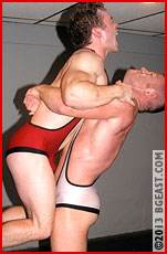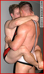 Karisma chuckles at first. Then gasps in shocked suprise. Then his freckled face flushes dark red as he grimaces, visibly suffering in the agonizing torture. "They're not long, but they're strong!" he admits through gritted teeth. With ease, the American impressively picks his opponent up, still latched to his waist, and tries to counter with a bearhug, but Gabriel is going nowhere. The angelic Brit coos and whispers seductively into Kid Karisma's face, which is twisted in agony. Fighting against the blinding pain, Karisma steals the opportunity to squeeze Gabriel's hot, muscled ass. (Who wouldn't?) Playful laughter is punctuated with grunts of pain and groans of pleasure. Punishment and passion.