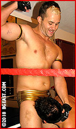 And when Big Toney Rico effortlessly steps over the top rope and asks, "Can second place do this?", Ty kicks the top rope right up into the handsome stud's sack! Toney's impressive entrance into the ring ends up being a stumbling collapse to the canvas as he clutches his injured family jewels. Not content with inflicting that particular indignity, Ty grabs Toney's ankles and grinds his boot into the stud's bulge. So much for good sportsmanship!