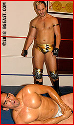 Ty delivers his big flying butt bump right into the big boy's face and makes him worship that "first place gold trophy" derriere. The Trophy Boy revels in each and every opportunity to plant that "tyriffic" bubbly butt right in his opponent's face, securing a payback KO with his own version of the figure 4 head scissors, affording him the opportunity to bury that butt on Toney's face for a long, gyrating, sexy smother pin.