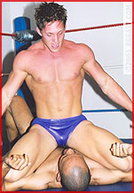 Barefoot in the ring and clad in his skimpiest trunks yet, Justin's assets are on ample display. "So you're the Goldenboy?" Doc sneers, "I'm not impressed." Technique vs. Strength: Holliday scores a submission with a visibly painful wrenching neck crank. But when he entwines his legs with Justin's and holds him down for an ultra-intimate full body pin, he clearly isn't as disinterested as his opening trash-talk implied. Justin scores with a cobra clutch and then full nelson/scissors combo, earning some grudging respect. But respect isn't the same thing as affection. Increasingly aggressive grappling. The final sleeper hold is perhaps the longest and most tightly cranked sleeper in BGE history. Three matches on one tape, each distinctive and offering a different side of Justin Pierce at his most viewable. A must have video!