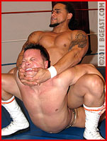But unfortunately for hapless Kieran, the massive stud recollects himself and deftly hoists him up into the air and breaks the hold, and just like that, Kieran goes from being large and in charge to draped over the stud's knee in an over the knee backbreaker! After punishing the punk over his knee long enough to elicit several submissions from most wrestlers, Badass lifts this wannabe bad ass like he weighs nothing, climbs up onto the ring apron and body slams Kieran right into the ring, and right over the top rope! "My back!" Kieran moans in agony as he rolls around, while Badass just looks down on him in disgust, and perhaps a touch a little excitement. Kieran recovers enough to deliver a punch to the big man's belly, but it doesn't even phase him - and once again he just scoops Kieran up and slams him down - and now the serious beatdown of the muscle boy truly begins, from another rookie with plenty more to prove than the erstwhile narcissist.