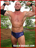 Biff Farrell is, of course, one of the most popular babyfaces of the past decade at BG East. His wholesome, military-grade good looks, his easy and natural smile, and, not least of all, his considerable talents as a wrestler are all part of his charm. He's also bulgy in the right places, with a heft you can practically feel just looking at him. If you ask us, it's a shame what Brute Baynard is about to do to the guy. Brute's talents in the ring are even better known than Biff's, with a physique that appears to be carved out of the side of a mountain. His sneer is as easy and natural as Biff's smile. And he's eager (you could even say chomping at the bit) to give Biff pointers on being a bodybuilder-slash-wrestler.