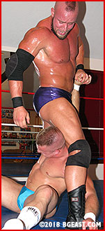 Baynard uses his massive leg on Biff's broad shoulders in a wrist-bending nelson variation