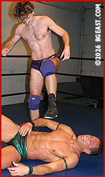 The friendly opening handshake takes a decidedly unsportsmanlike turn when Santiago refuses to let go, jerking Reid's long, lean body into an ambush full nelson. The rock-hard newbie delights in spinning his rival until Reid's long legs get tangled in the ropes and Santiago concedes to the clean break. "I knew it," Reid whines petulantly as he heads for the door. "You're a fucking cheater! All the wrestlers around here are!"