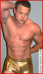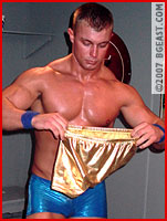 Enter Kieran, our hot little muscle stud with the ego of a much more successful wrestler. Kieran is wearing his trademark gold metallic, this time in a square cut that shows off the hard ass that the fans so appreciate. True, Kieran hasn't won a lot of matches'maybe it's none'but one would never guess from the ego he sports. Talk around the locker room is that Kieran cares more about his fan mail than actually winning matches, and Aryx once sneeringly referred to him as 'all pose, no skill''looking to use his experience with BGEast as a means to get some kind of modeling contract. 'I don't even know why The Boss keeps him around,' he went on, 'except to inflate the records of some of the LOSERS on contract around here.' The talk was getting so bad The Boss called Kieran in for a chat before the match with Jace.